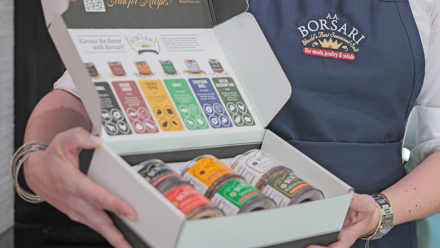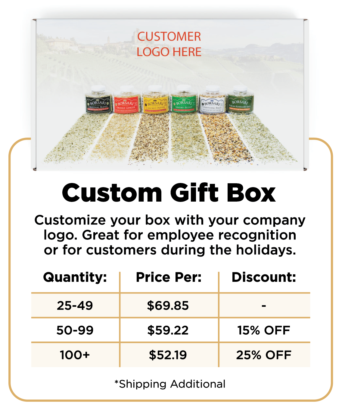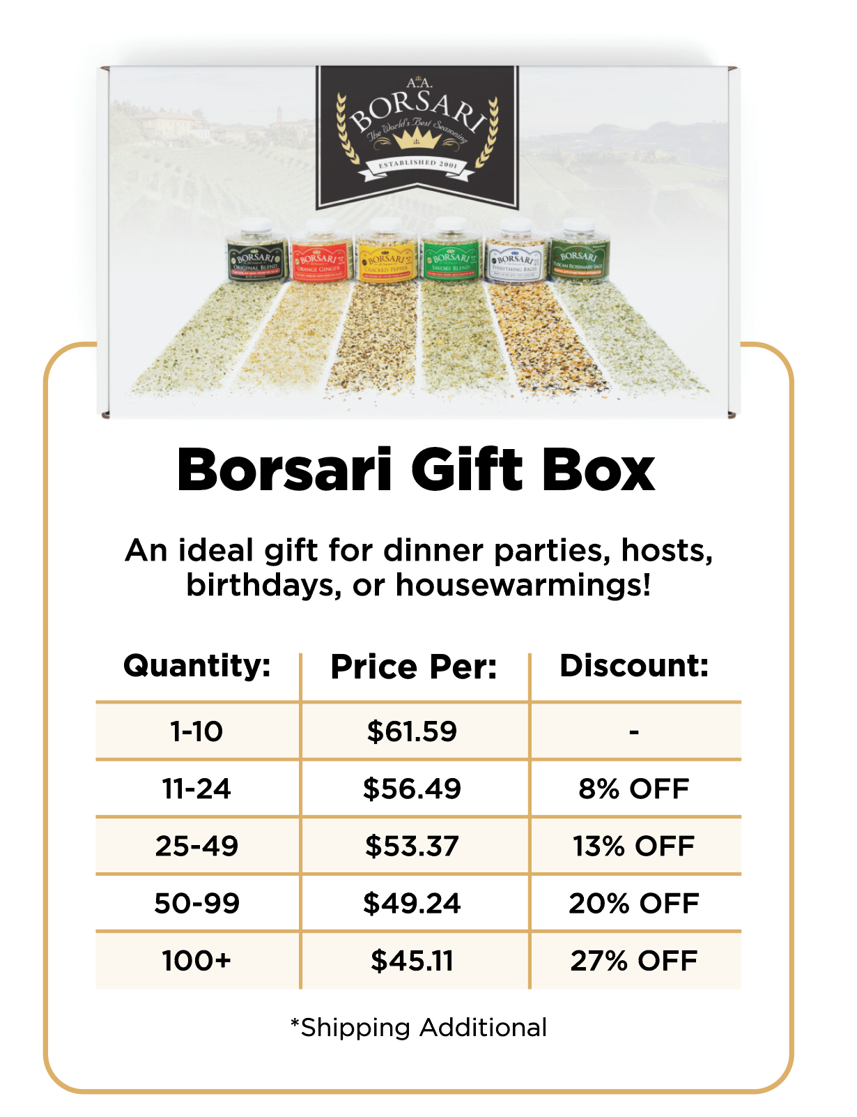 Featuring the Borsari logo on the box, this seasoned salt set is a perfect item to offer customers for Holiday gifting.