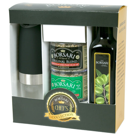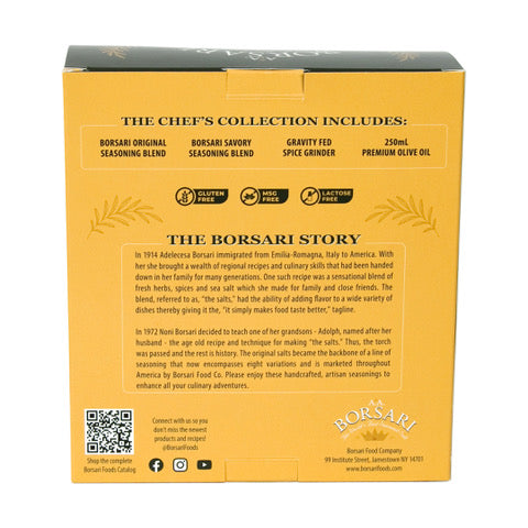 Borsari Food Company created the exclusive Chef's Collection as the perfect gift option to share your love of Borsari Seasonings and add a touch of elegance to a loved one's kitchen when the next holiday, birthday, housewarming, wedding, or other gift need arises!