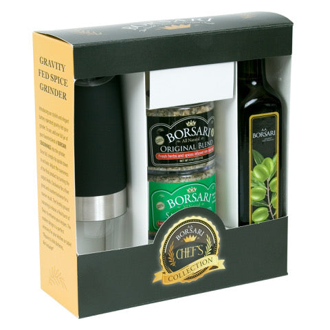This exclusive offering is the perfect gift for the foodie in your life and brings together the best of Borsari in one complete package. Included in each Chef's Collection are two of our best-selling seasoning blends, Original and Savory, set to enhance the flavors of your favorite dishes. Along with the seasoning blends, we've included a stylish Gravity Fed Spice Grinder, complete with a reservoir that holds one entire jar of Borsari Seasonings and the ability to adjust coarseness to best fit your use. Lastly, we've included 250 mL of our popular extra-virgin olive oil with a fruit-forward nose and a robust peppery finish to help provide that finishing touch or as the perfect binder before applying seasonings.