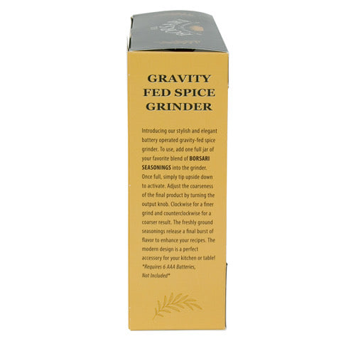Introducing our stylish and elegant battery-operated gravity-fed spice grinder. To use, add one full jar of your favorite blend of Borsari Seasonings into the grinder. Once full, simply tip upside down to activate. Adjust the coarseness of the final product by turning the output knob. Clockwise for a finer grind and counterclockwise for a coarser result. The fresh ground seasonings release a final burst of flavor to enhance your recipes. The modern design is a perfect accessory for your kitchen or table! Requires 6 AAA batteries - not included*