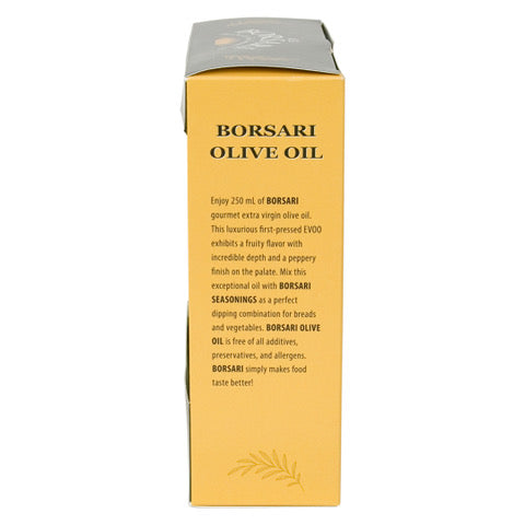 Enjoy 250 mL of Borsari gourmet extra virgin olive oil. This luxurious EVOO is first-pressed and exhibits a fruity flavor with incredible depth and a peppery finish on the palate. Mix this exceptional oil with Borsari Seasonings as a perfect dipping combination for bread and vegetables. Borsari Olive Oil is free of all additives, preservatives, and allergens. Borsari simply makes food taste better!