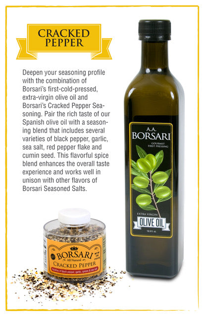 Deepen your seasoning profile with the combination of Borsari’s first-cold-pressed, extra-virgin olive oil and Borsari’s Cracked Pepper Seasoning. Pair the rich taste of our Spanish olive oil with a seasoning blend that includes several varieties of black pepper, garlic, sea salt, red pepper flake, and cumin seed. This flavorful spice blend enhances the overall taste experience and works well in unison with other flavors of Borsari Seasoned Salts.