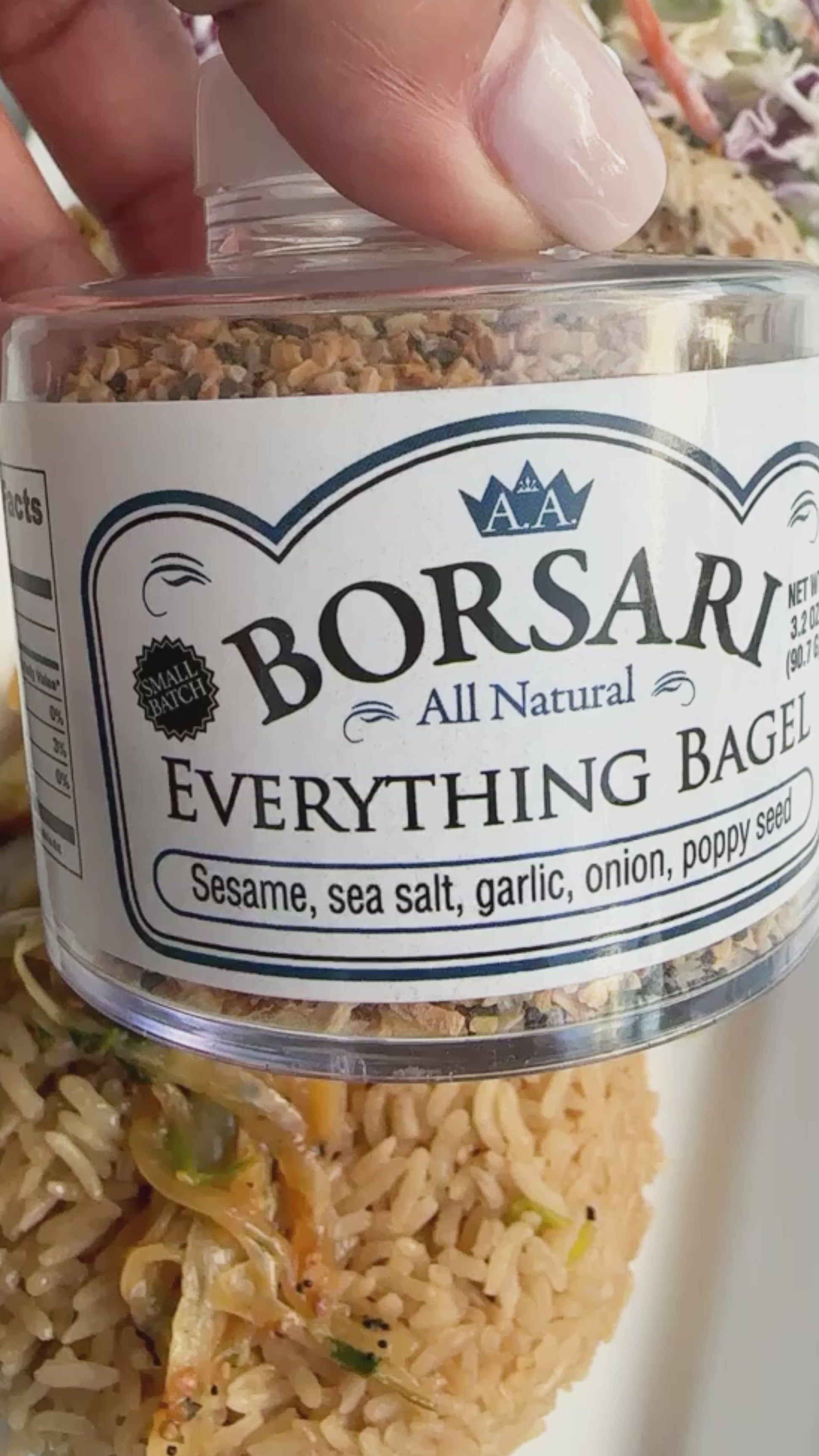 Borsari Everything Bagel Seasoning: Well, we don’t call it “Everything” for nothing. Use it on a plain bagel with cream cheese for the “right” amount of flavor you like. Put a little in your bread dough when baking. Some like it on fish, salads and vegetables. Sprinkle it on whatever you like.