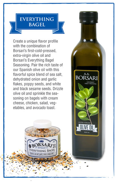 Create a unique flavor profile with the combination of Borsari’s first-cold-pressed, extra-virgin olive oil and Borsari’s Everything Bagel Seasoning. Pair the rich taste of our Spanish olive oil with this flavorful spice blend of sea salt, dehydrated onion and garlic flakes, poppy seeds, and white and black sesame seeds. Drizzle olive oil and sprinkle the seasoning on bagels with cream cheese, chicken, salad, vegetables, and avocado toast.