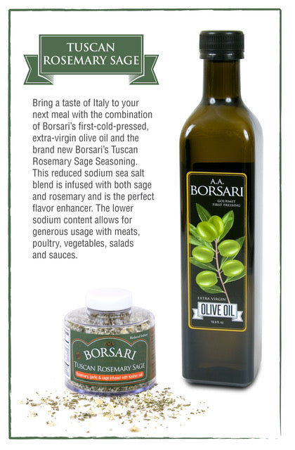Bring a taste of Italy to your next meal with the combination of Borsari’s first-cold-pressed, extra-virgin olive oil and the brand new Borsari’s Tuscan Rosemary Sage Seasoning. This reduced sodium sea salt blend is infused with both sage and rosemary and is the perfect flavor enhancer. The lower sodium content allows for generous usage with meats, poultry, vegetables, salads, and sauces.